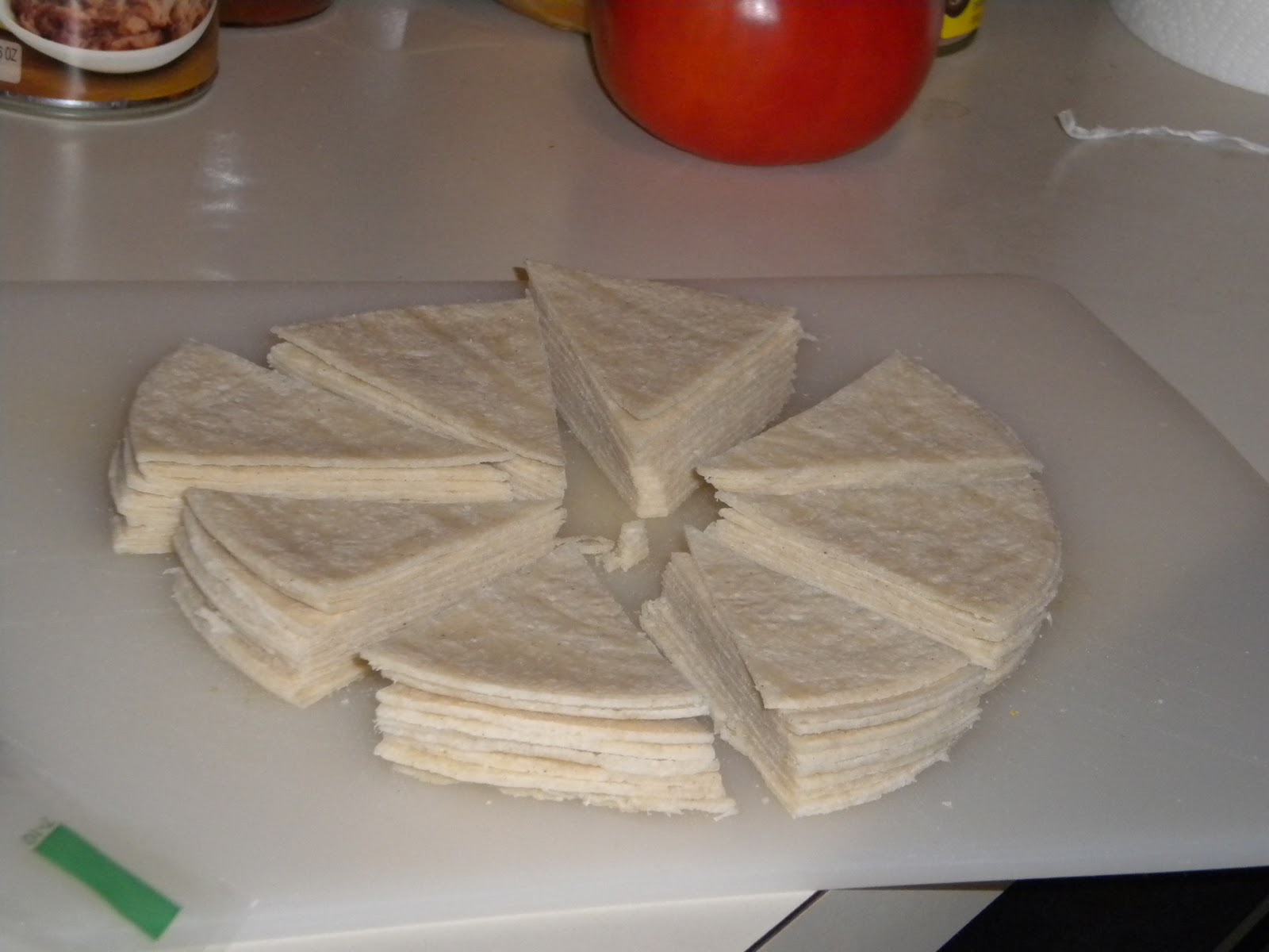 1. Pour vegetable oil in the pot, about 2-3" deep, on high. While it's heating, cut your tortillas into eighths. (Because I'm taking these to a party, I'm making quite a large batch).